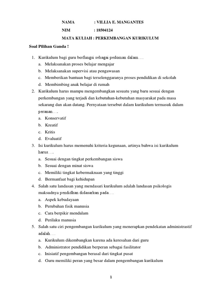 Latihan Soal Pilihan Ganda Tentang Pengembangan Kurikulum Lengkap Jawaban Docx