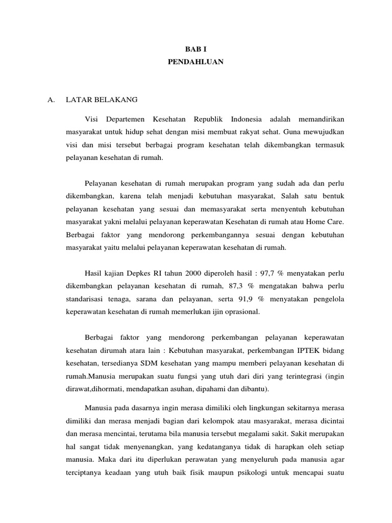 Save Proposal Usaha Homecare For Later. Sejalan dengan hakekat pembangunan di bidang kesehatan yaitu m eningkatkan derajat k esehatan setiap. Persiapan - Pastikan identitas pasien - Bawa denah petunjuk tempat tinggal pasien.