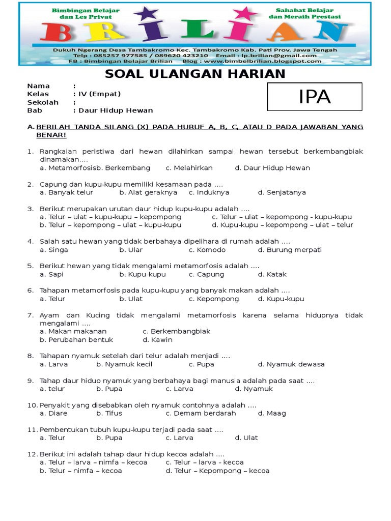Soal Ulangan Harian Ipa Kelas 4 Sd Bab 4 Daur Hidup Hewan Pdf