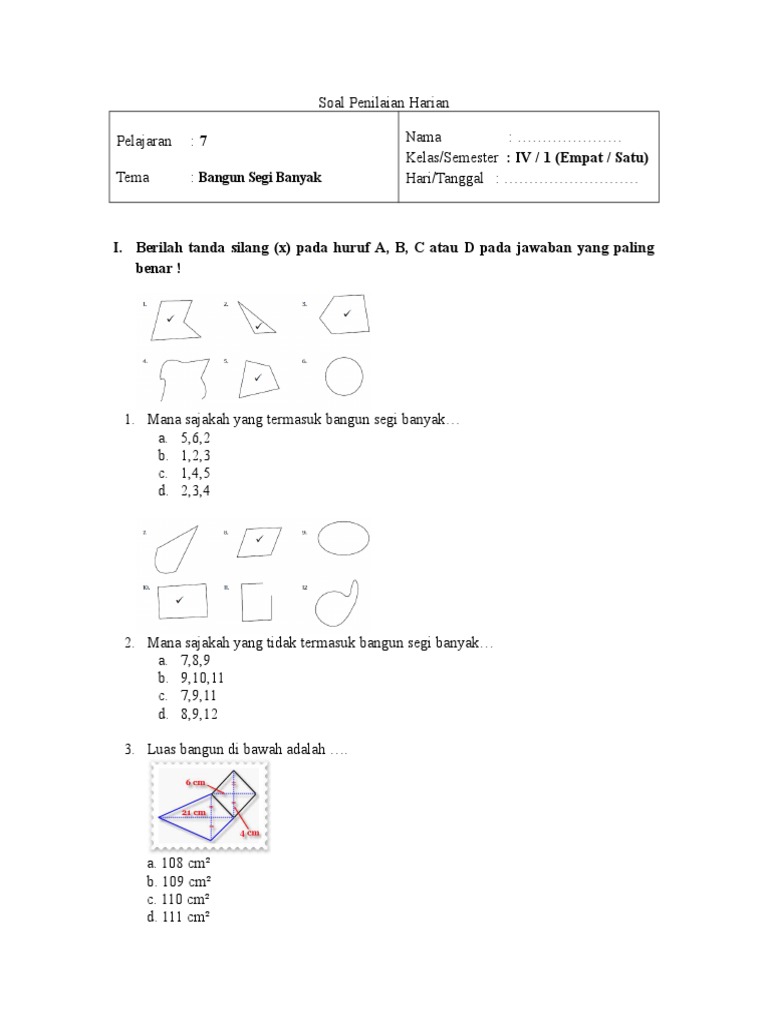 Latihan Soal Segi Banyak - Matematika SD Kelas 4. Baca juga. Soal pilihan ganda tentang bangun segi banyak kelas 4 sd yang bisa bapak ibu guru unduh secara gratis dengan menekan tombol download.
